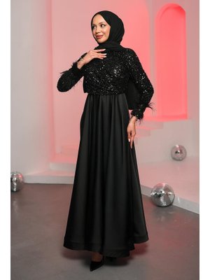 İmaj Butik Siyah Kolları Tüğlü Üstü Payetli Saten Abiye Elbise