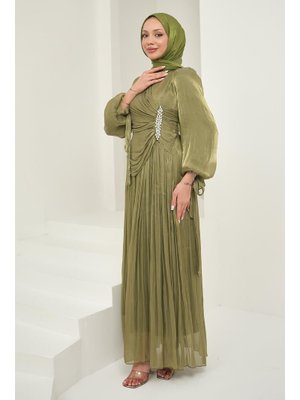 İmaj Butik Haki Önü Taş Detaylı Kol Bağlamalı Abiye Elbise