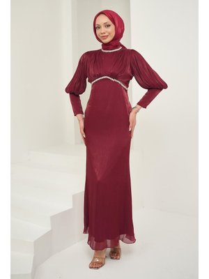 İmaj Butik Bordo Önü Piliseli Taşlı Abiye Elbise
