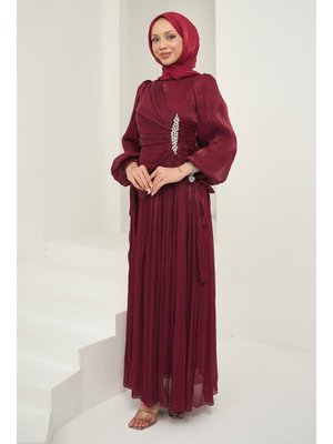 İmaj Butik Mürdüm Önü Taş Detaylı Kol Bağlamalı Abiye Elbise