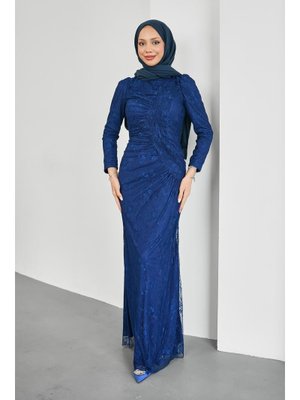 İmaj Butik Lacivert Önü Büzgülü Güpürlü Abiye Elbise
