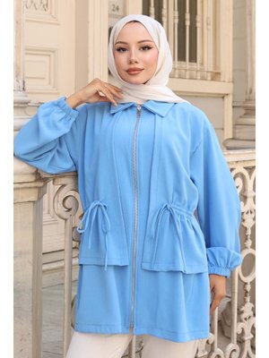Benguen Mavi Beli Büzgülü Fermuarlı Kısa Kap