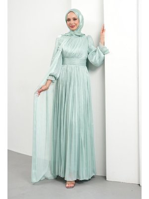 İmaj Butik Mint Yeşili Pelerin Detaylı Piliseli Abiye Elbise