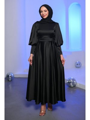 İmaj Butik Siyah Yan Bağlamalı Saten Abiye Elbise