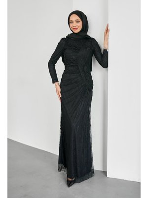 İmaj Butik Siyah Önü Büzgülü Güpürlü Abiye Elbise