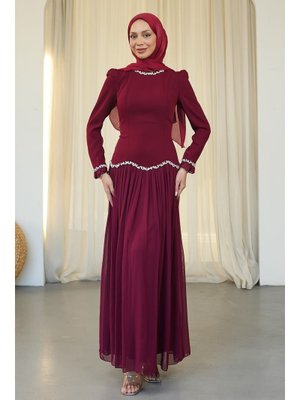 İmaj Butik Bordo Sırt Bağlamalı Taşlı Abiye Elbise