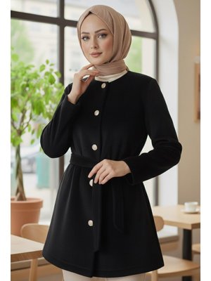 Tofisa Siyah Sıyah Değmeli Kuşaklı Kaşe Ceket