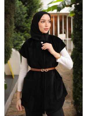 İmaj Butik Siyah Kemerli Astarlı Kaşe Yelek