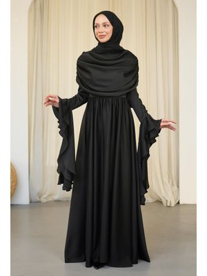 İmaj Butik Siyah Kol Katlı Önü Drapeli Saten Abiye Elbise