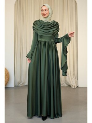 İmaj Butik Koyu Yeşil Kol Katlı Önü Drapeli Saten Abiye Elbise