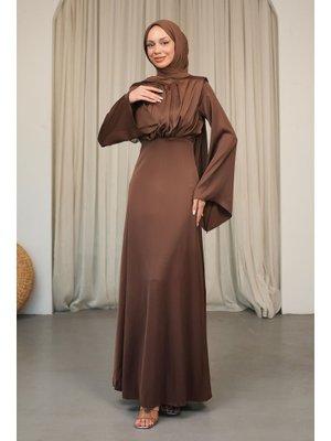 İmaj Butik Kahverengi Omuzları Vatkatlı Saten Abiye Elbise