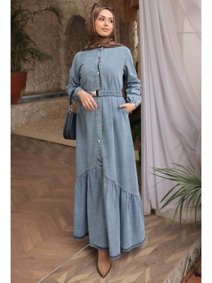 İmaj Butik Mavi Düğmeli Lastik Kemerli Kot Elbise