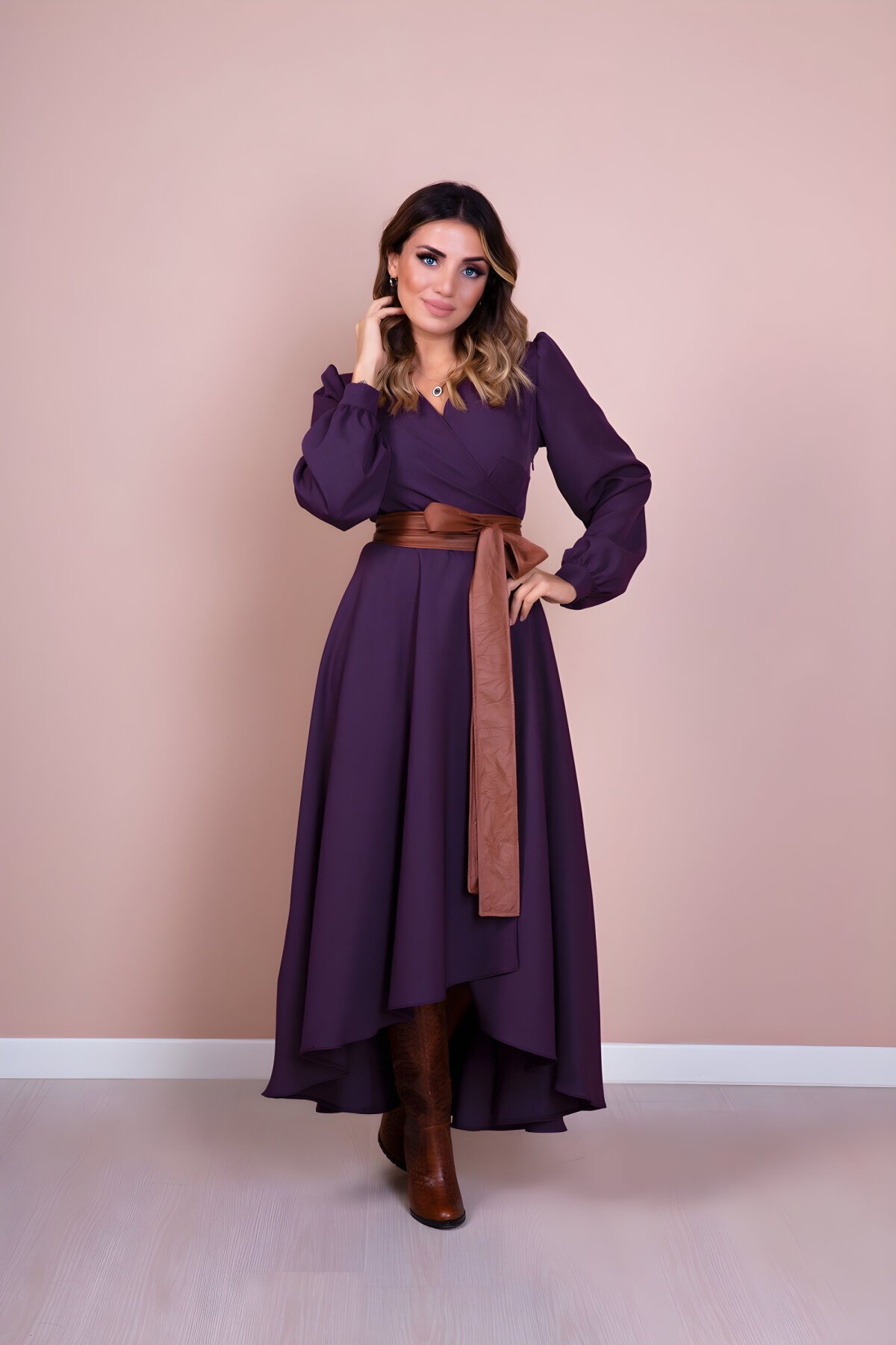 BidoluelbiseAsimetrik Kesimli Uzun Kol Mürdüm Taba Deri Kemerli Tesettür Elbise