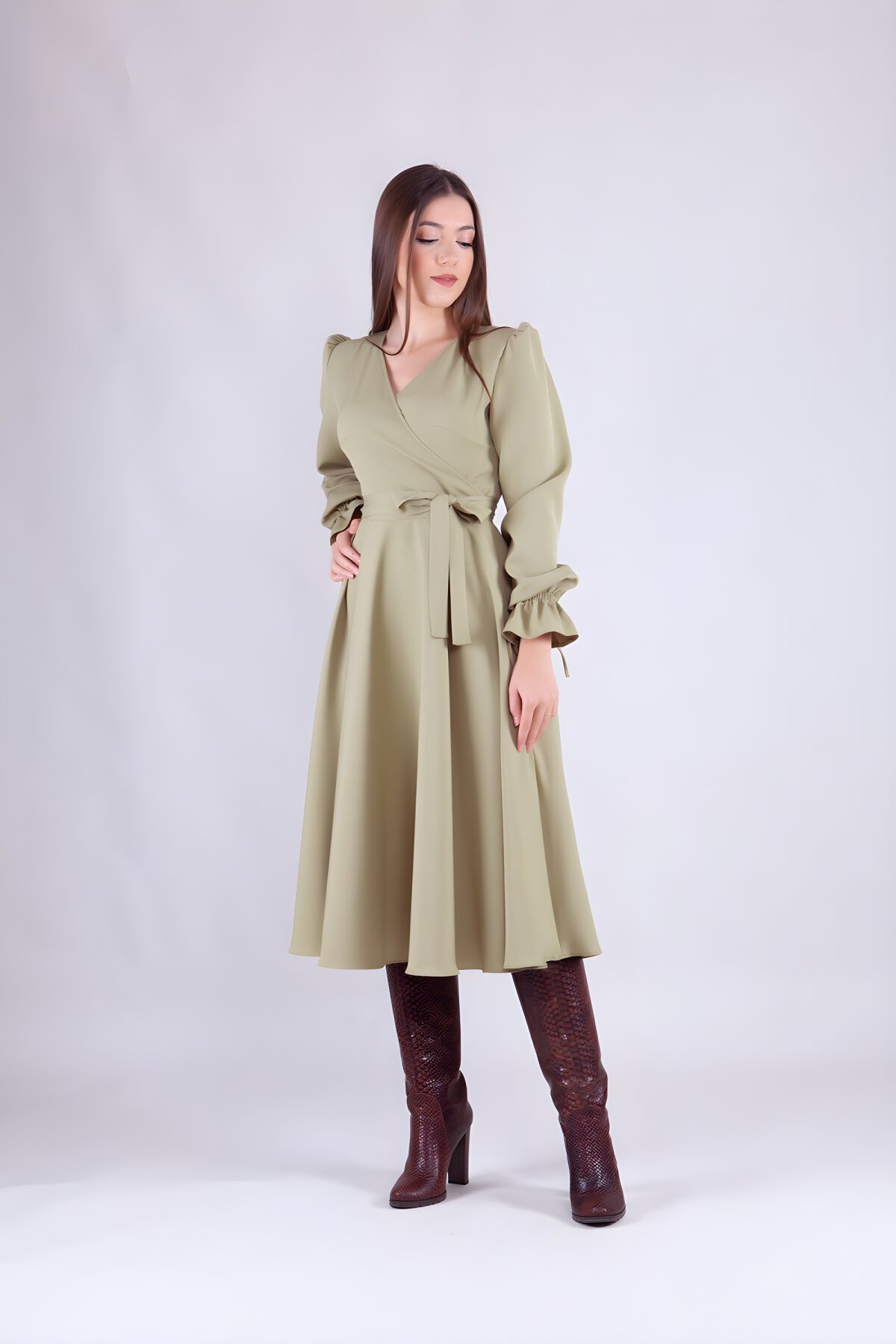 BidoluelbiseKruvaze Yaka Uzun Kol Midi Boy Yağ Yeşili Tesettür Elbise