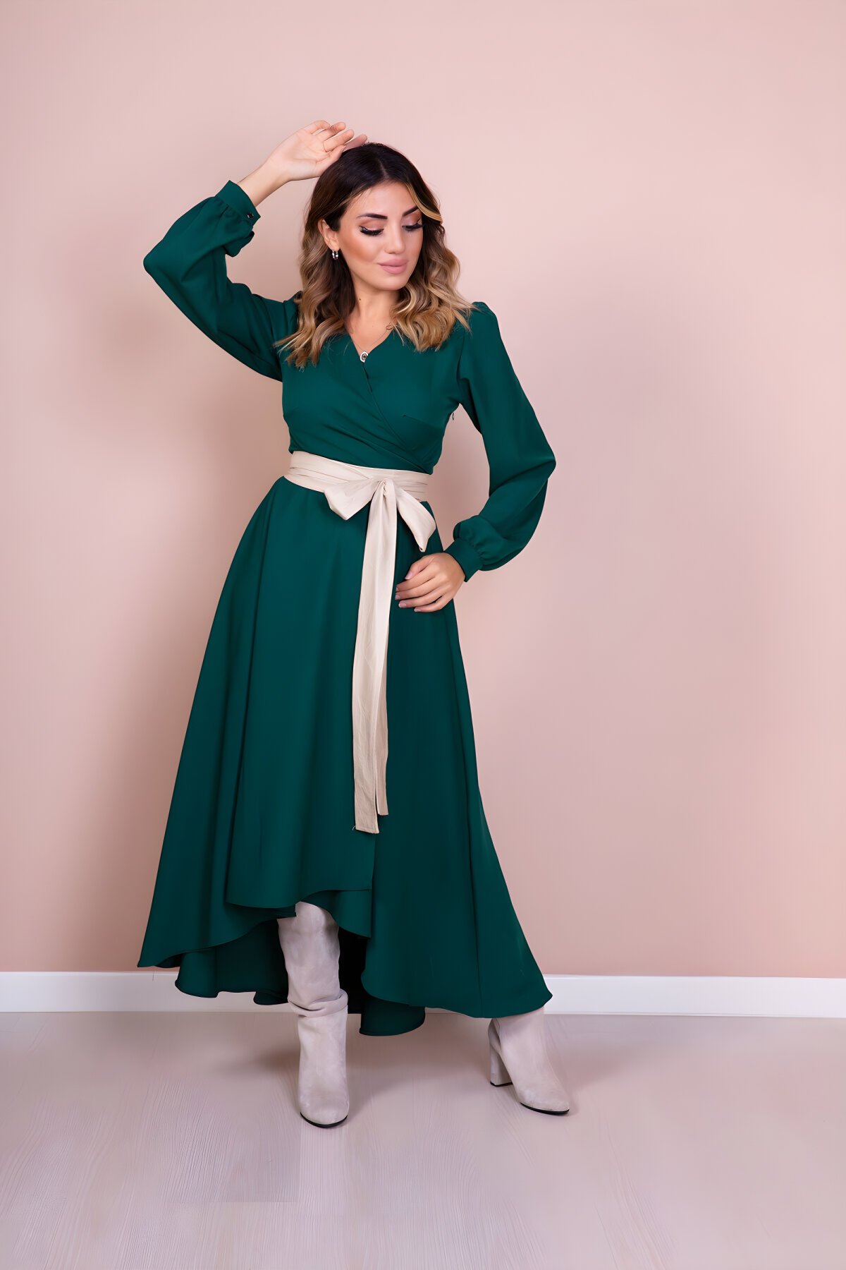 BidoluelbiseZümrüt Krem Rengi Deri Kemerli Asimetrik Kesim Uzun Kol Tesettür Elbise