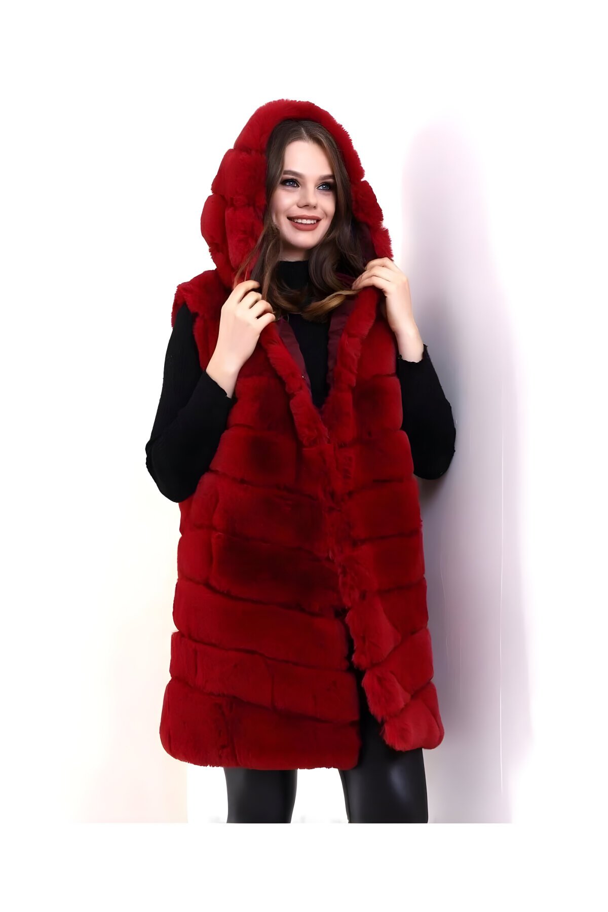 RAWEA FASHİONKapüşonlu Tam Astarlı Kırmızı Uzun Peluş Kürk Premium Kalite Tesettür Yelek