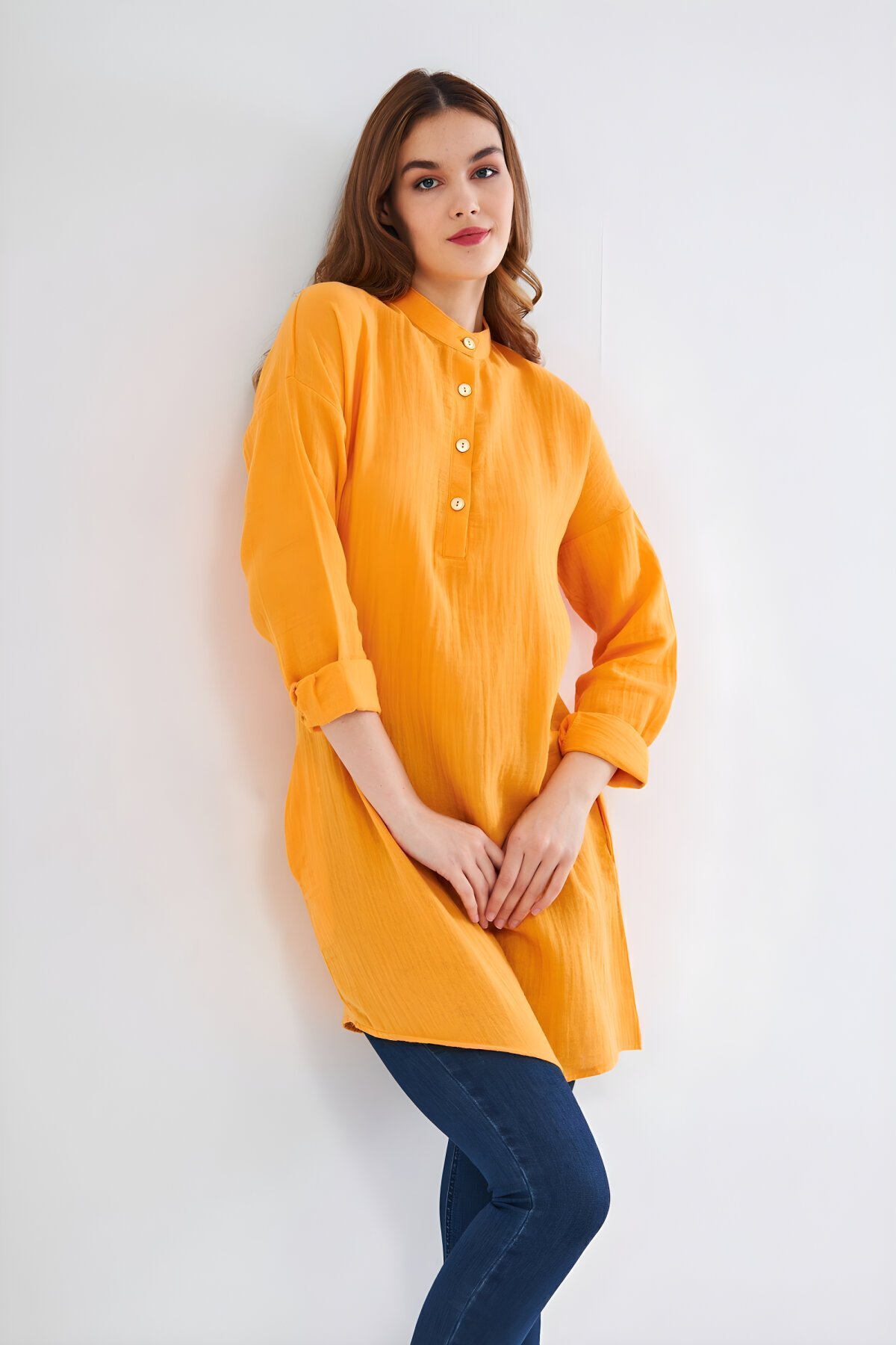 Pasaklı GiyimHardal Muslin Kumaş Hakim Yaka Cepli Uzun Kollu Yazlık Gömlek Tunik