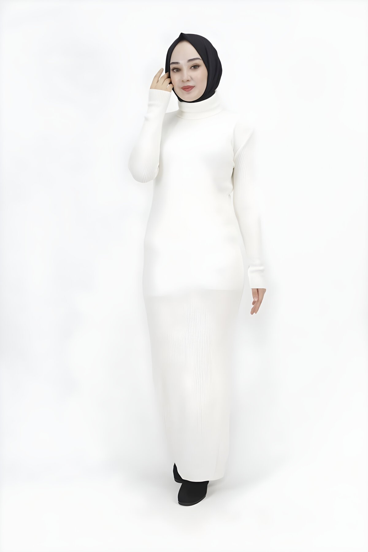 ButikBoğazalı Yaka Ekru Fitilli Triko Tesettür Elbise