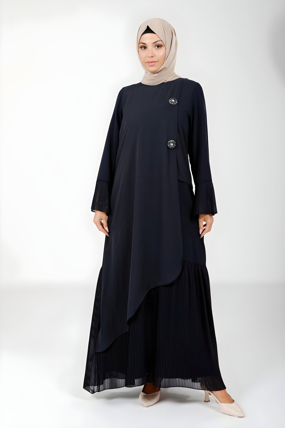 BeyzaLacivert Çiçek Detaylı Eteği Pliseli Tesettür Elbise