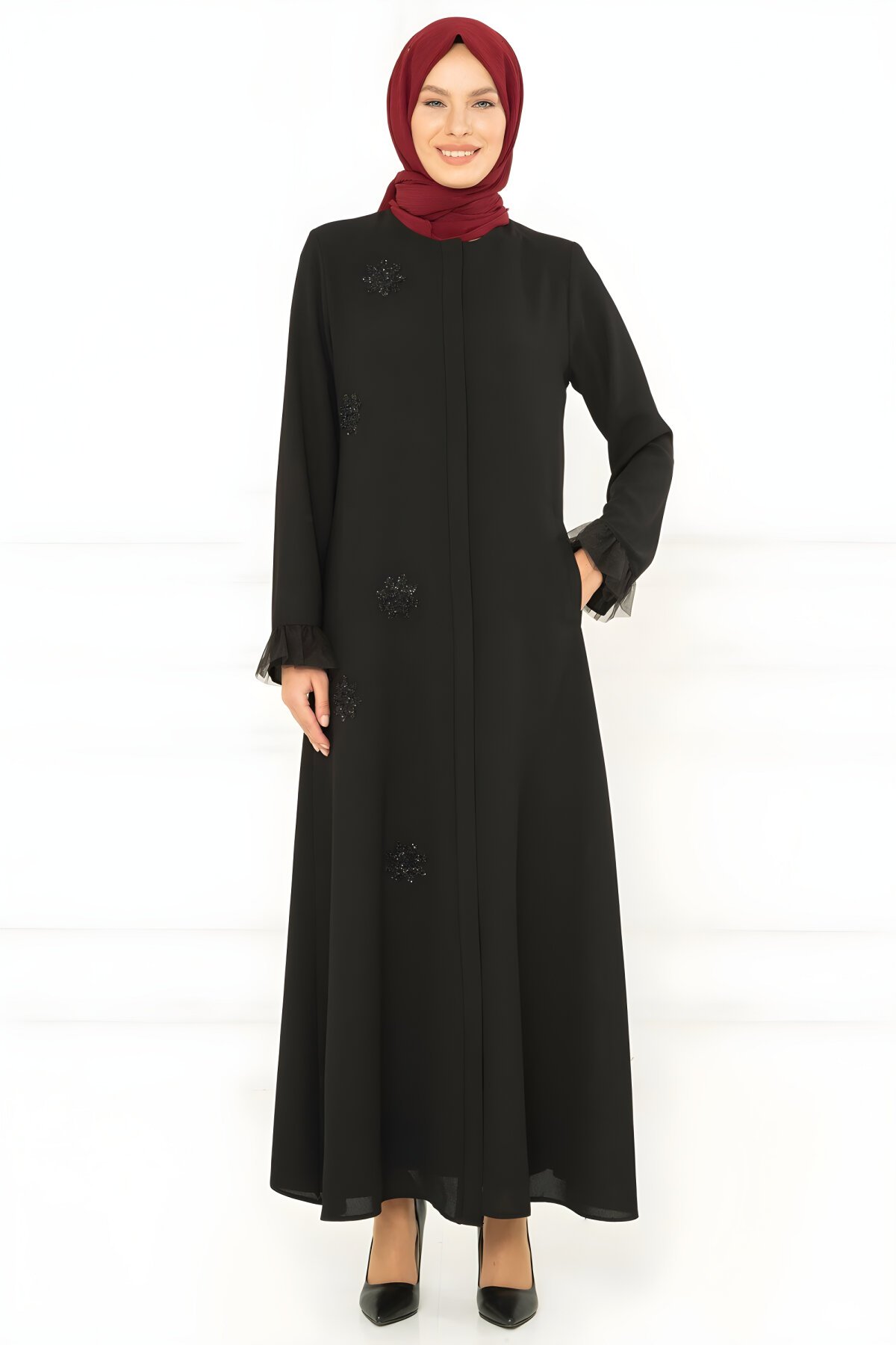 BeyzaSiyah Tül Detaylı Taş İşlemeli Ferace Modeli