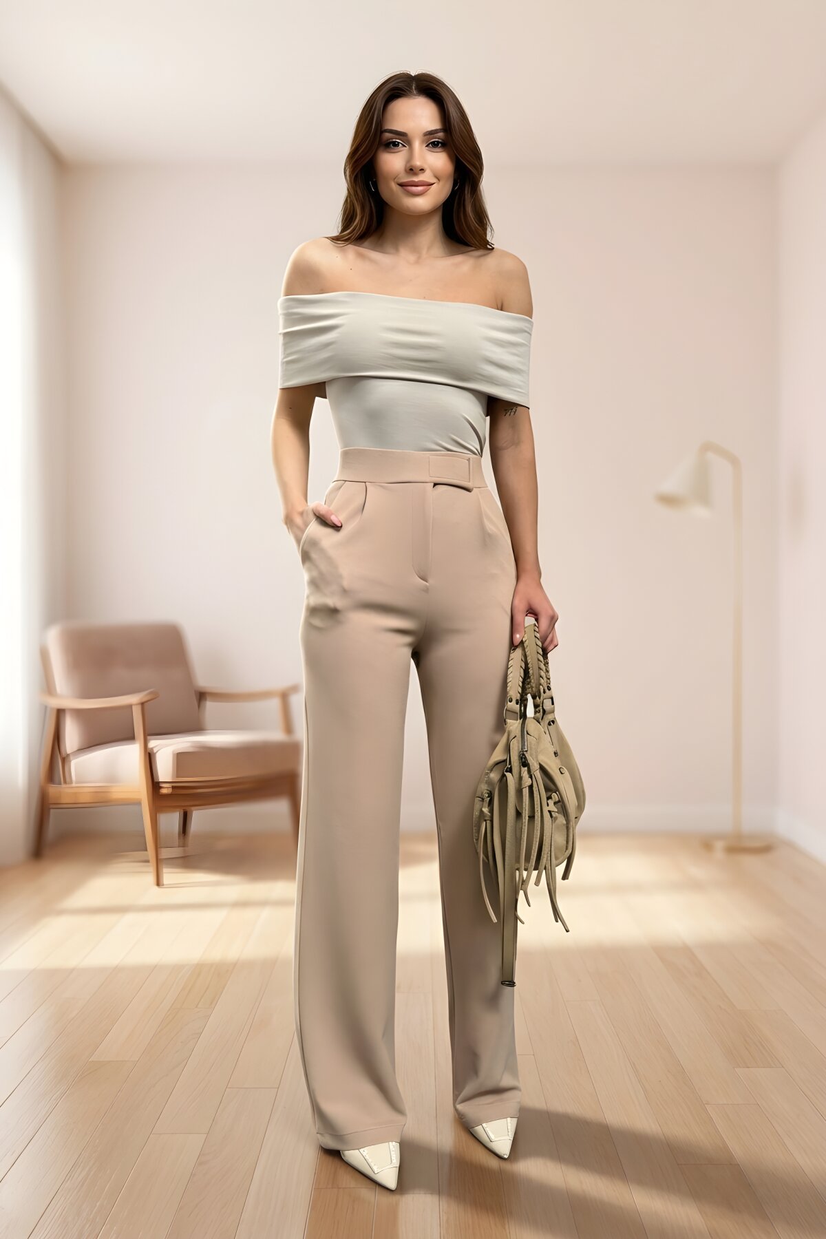 RAWEA FASHİONBej Jakar Palazzo Kesim Cırt Detaylı Tesettür Pantolon