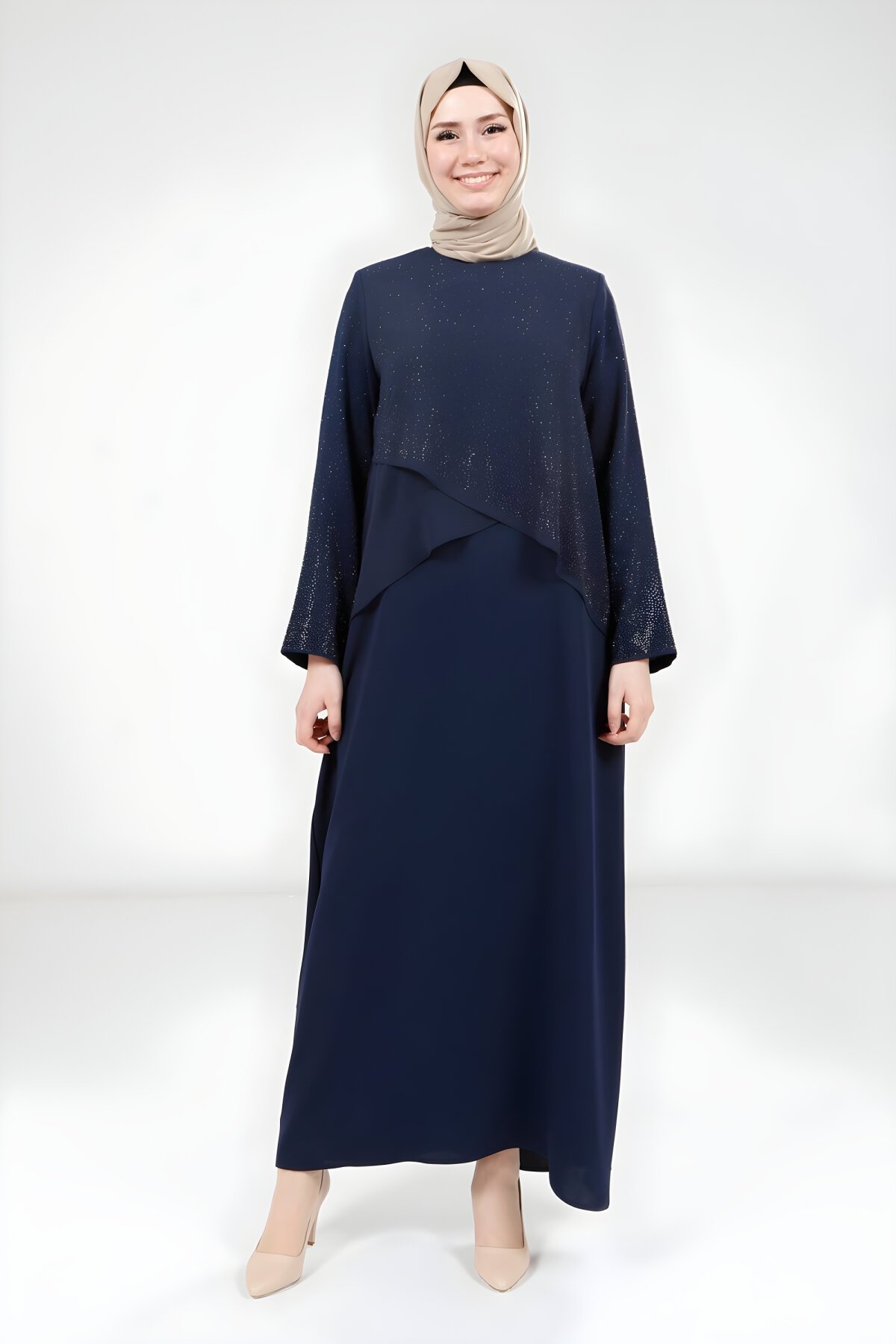 BeyzaTaş Detaylı Lacivert Şifon Tesettür Elbise