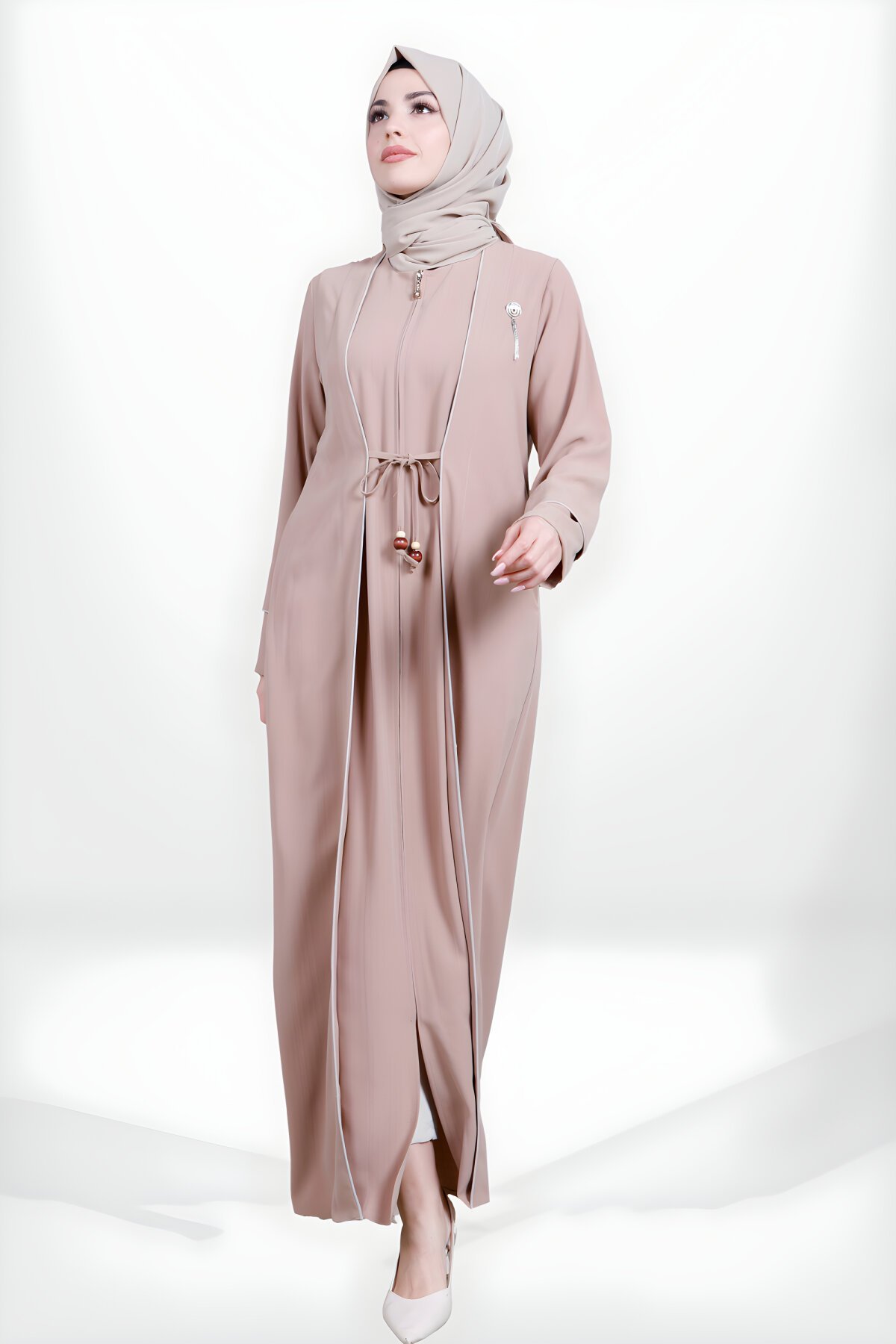 BeyzaÖnden Bağlamalı Biye Detaylı Fermuarlı Kapuçino Ferace