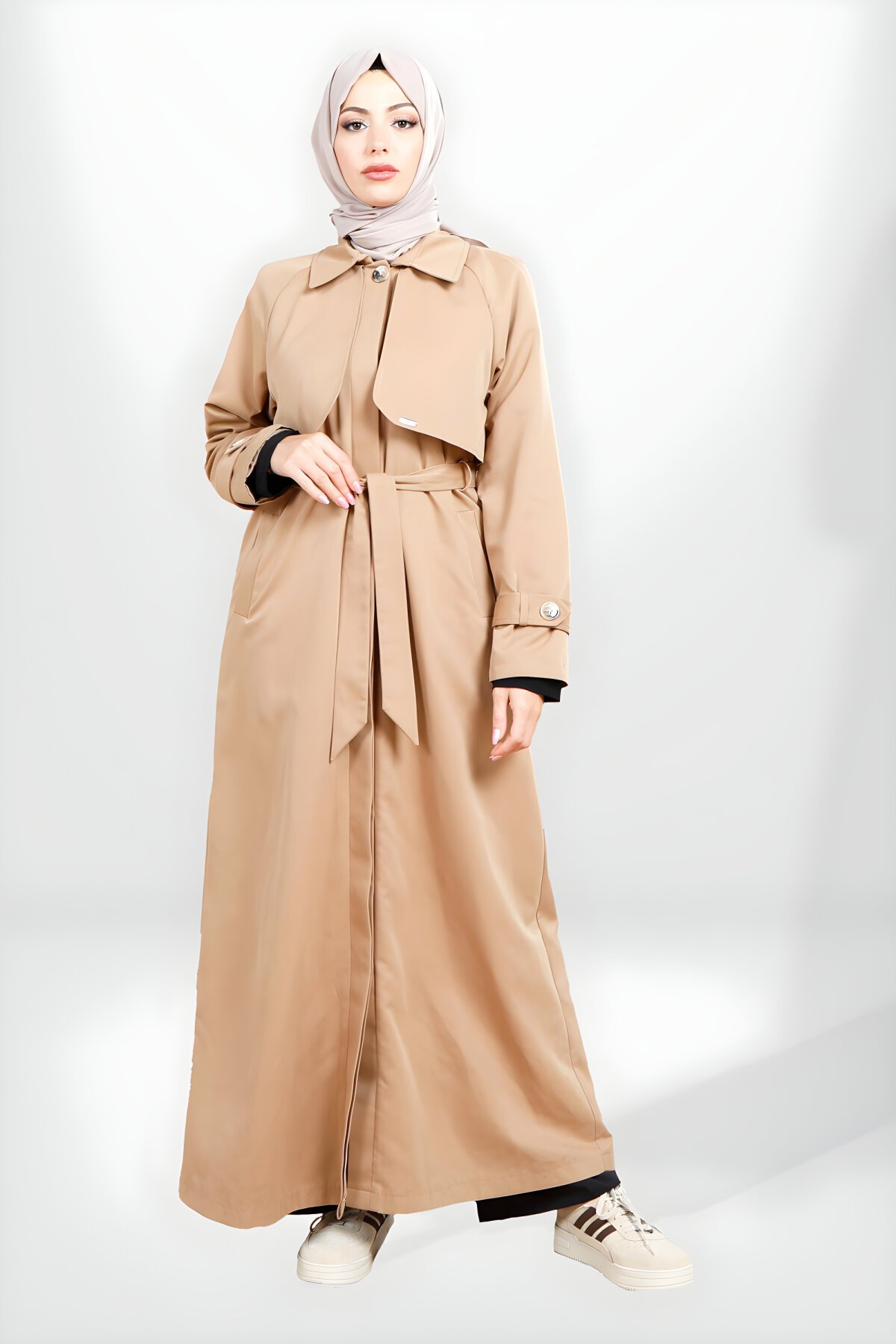 BeyzaRüzgarlık Detaylı Kuşaklı Bej Tam Boy Trençkot