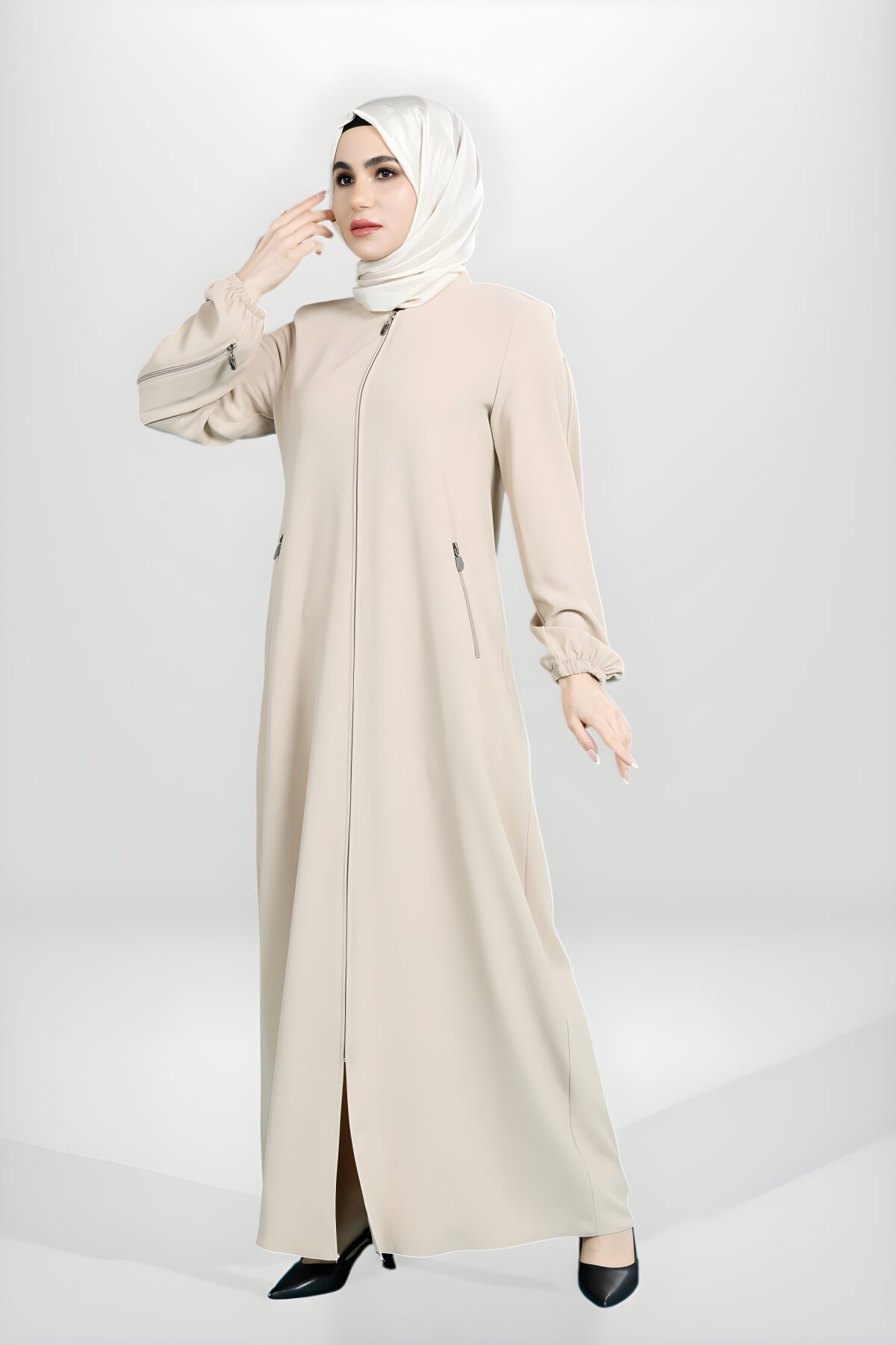 BeyzaFermuar Detaylı Kolu Ve Cepleri Olan Bej Fermuarlı Ferace
