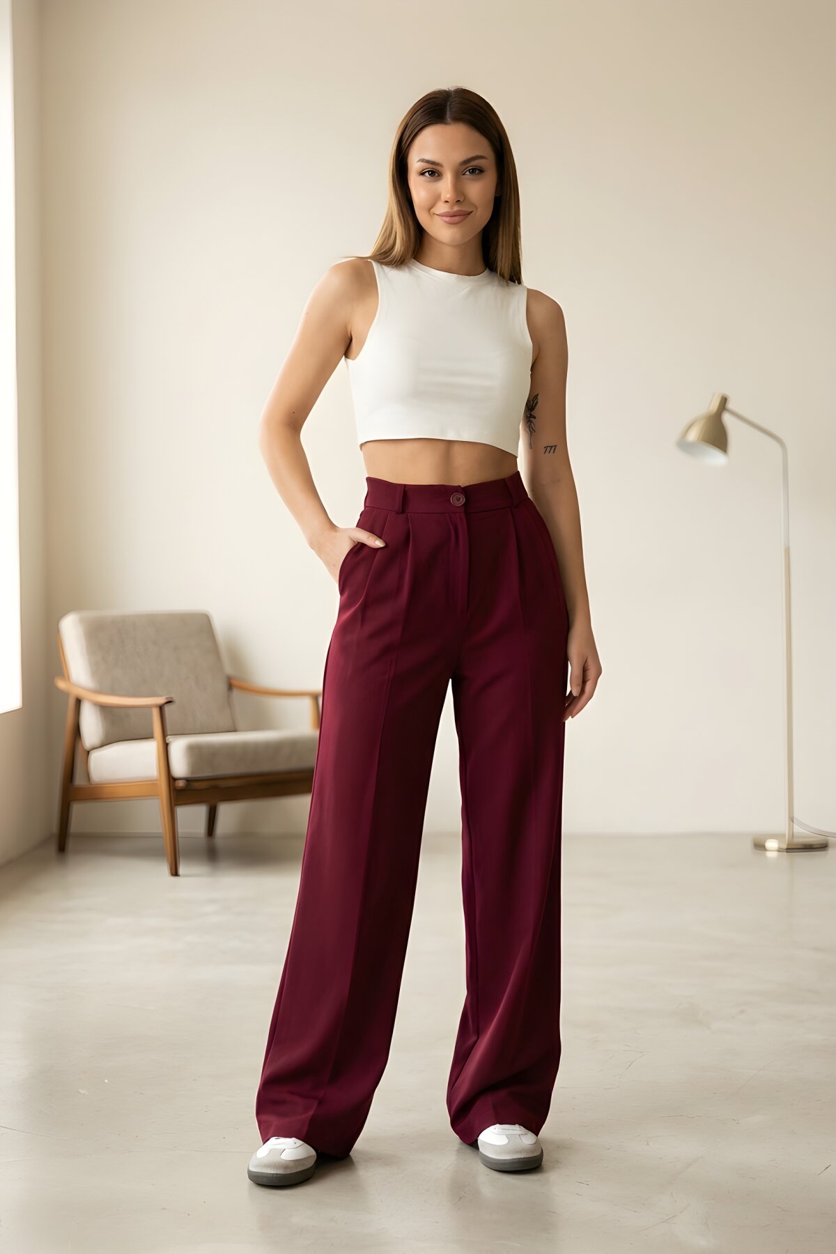 RAWEA FASHİONArkası Lastikli Dabıl Kumaş Bordo Palazzo Tesettür Pantolon