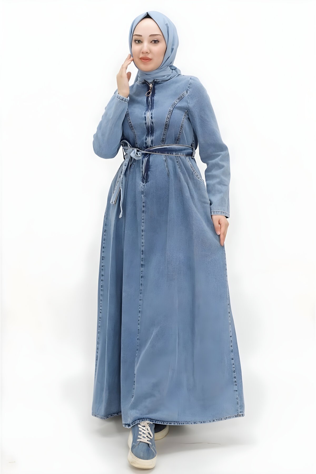 Bycoolest ButikKemerli ve Yaka Fermuarlı Buz Mavi Kot Tesettür Elbise