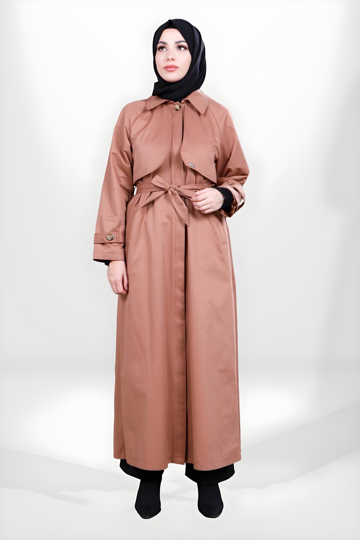 Astarlı ön tarafı aller detaylı gizli düğmesi olan kemer ve kol manşet tarafı kemerli tesettür bej trençkot.