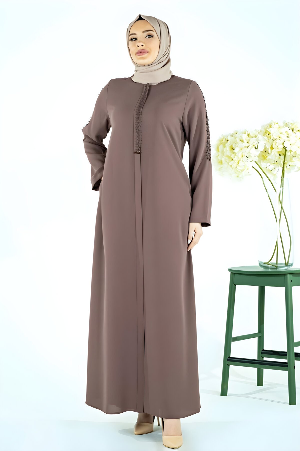 BeyzaKahverengi Berat Patı ve Kolu Şerit Detaylı Boncuklu Ferace