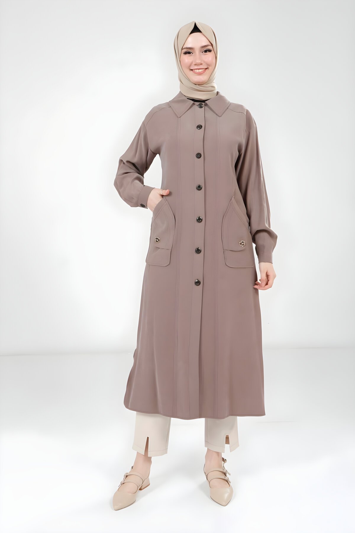 Beyza markasının Vizon Cep Aksesuarlı Giy Çık Kap modeli, zahmetsiz şıklık arayanlar için tasarlandı. Günlük kullanımda rahatlık sağlayan bu Kap, uzun ve modern kesimiyle dikkat çekiyor. Devr-i Tesettür güvencesiyle sunulan bu şık dış giyim parçası ile kombinlerinize anında zarafet katın. Tüm bedenler stokta.