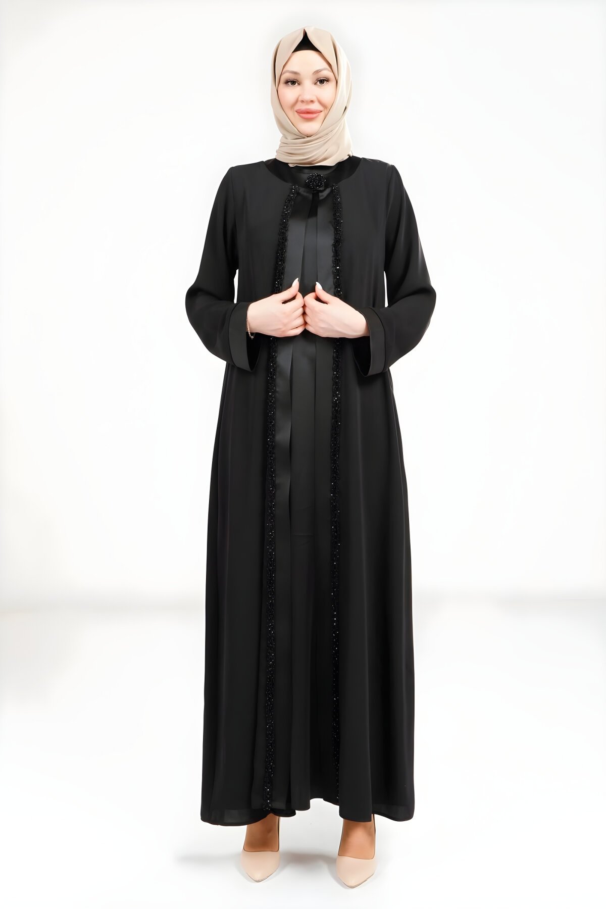 BeyzaSiyah Renk Saten Kumaş Tesettür Elbiseli Ferace