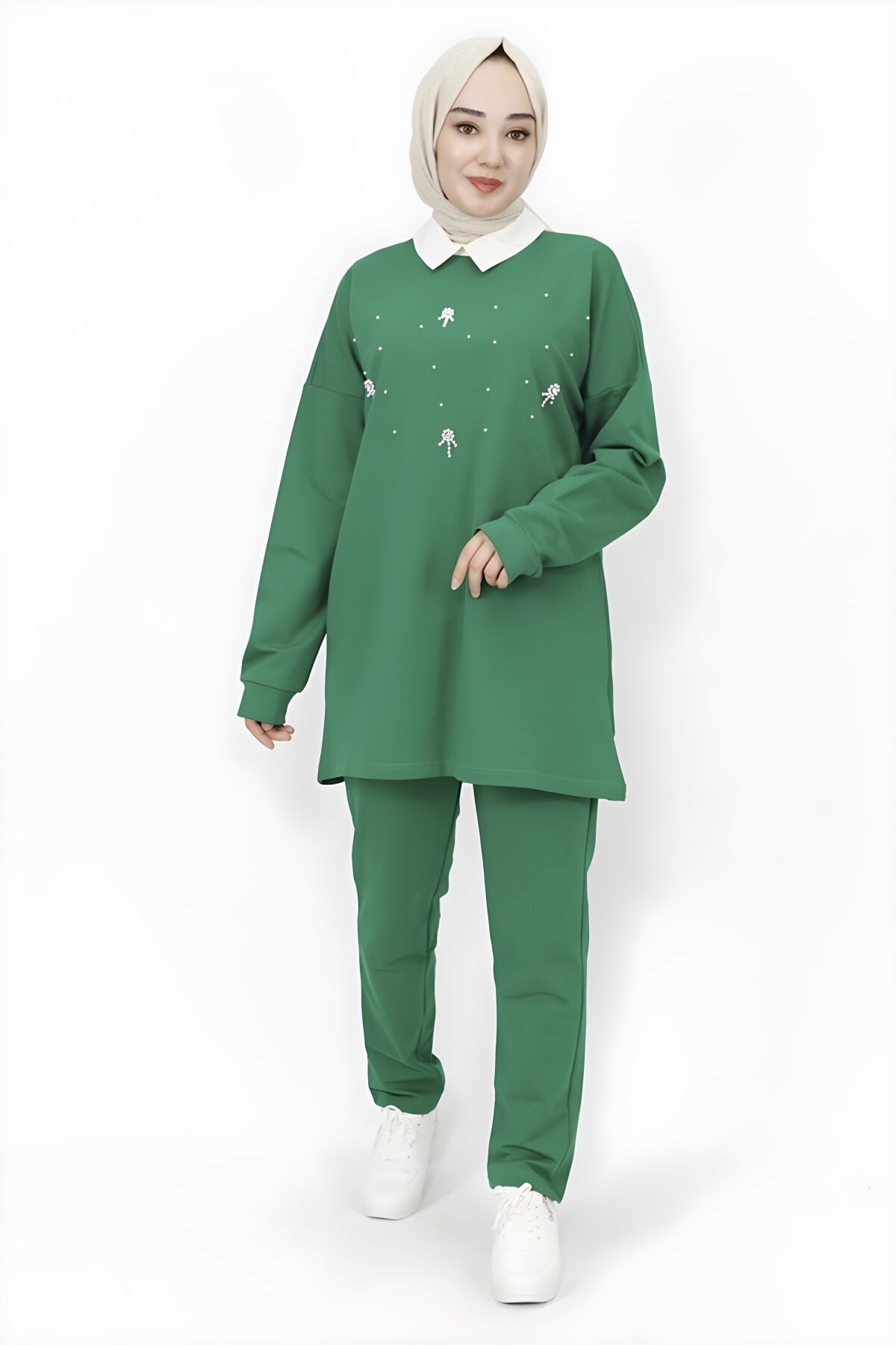 ButikGömlek Yaka İnci Ve Taş Detaylı Yeşil İki İp Kumaş Tesettür Takım