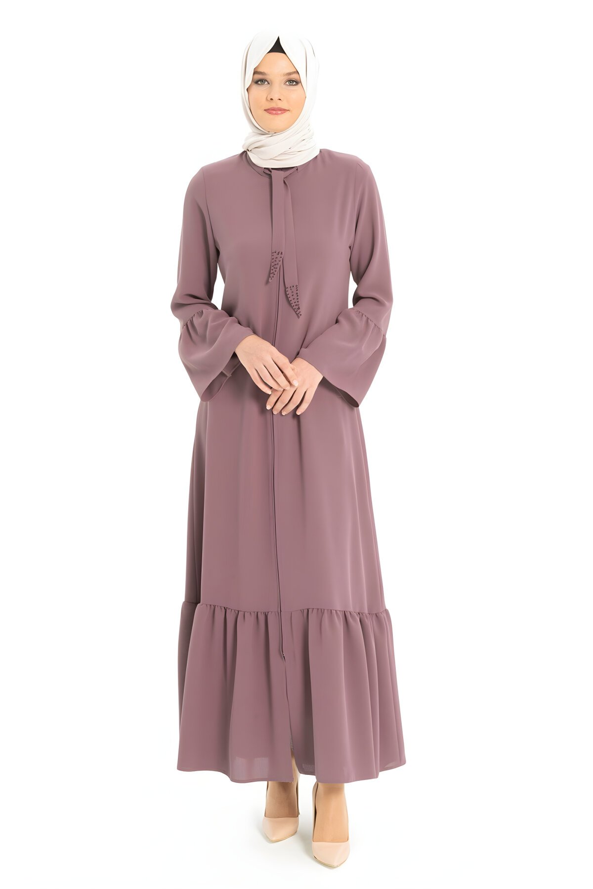 Astarsız , gizli fermuarlı boynundan bağcık çıkan kolları ve eteği büzgülü taş işlemeli şık kapuçino ferace. Esnek yapısı sayesinde kırışmaya dayanıklı, yumuşak dokulu, iç göstermez, Nefes Alan ve Ağırlık yapmayan kumaş özelliği ile sık kullanıma uygundur.