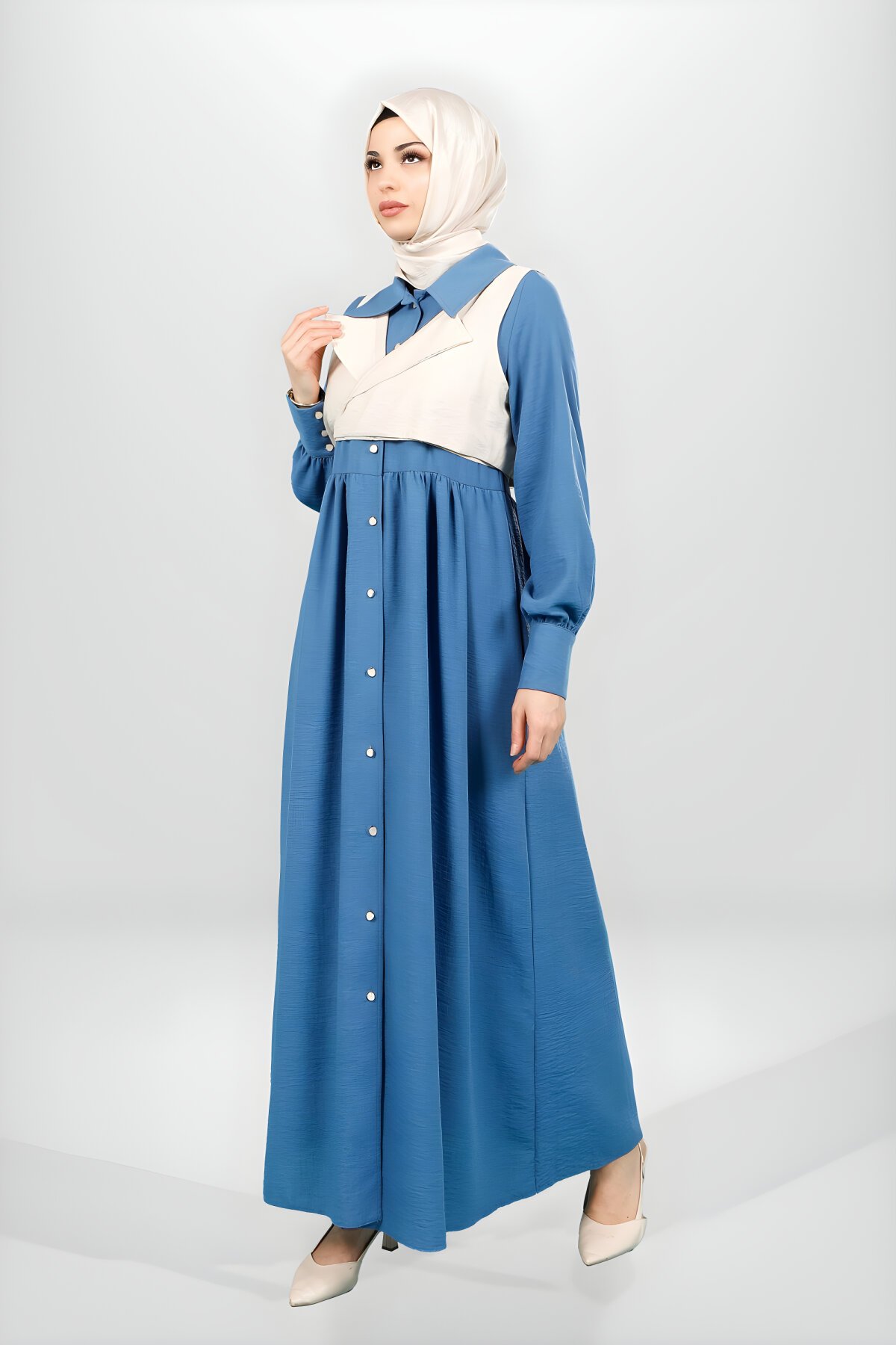 BeyzaSaks Mavisi Düğmeli Yelek Detaylı Tesettür Elbise