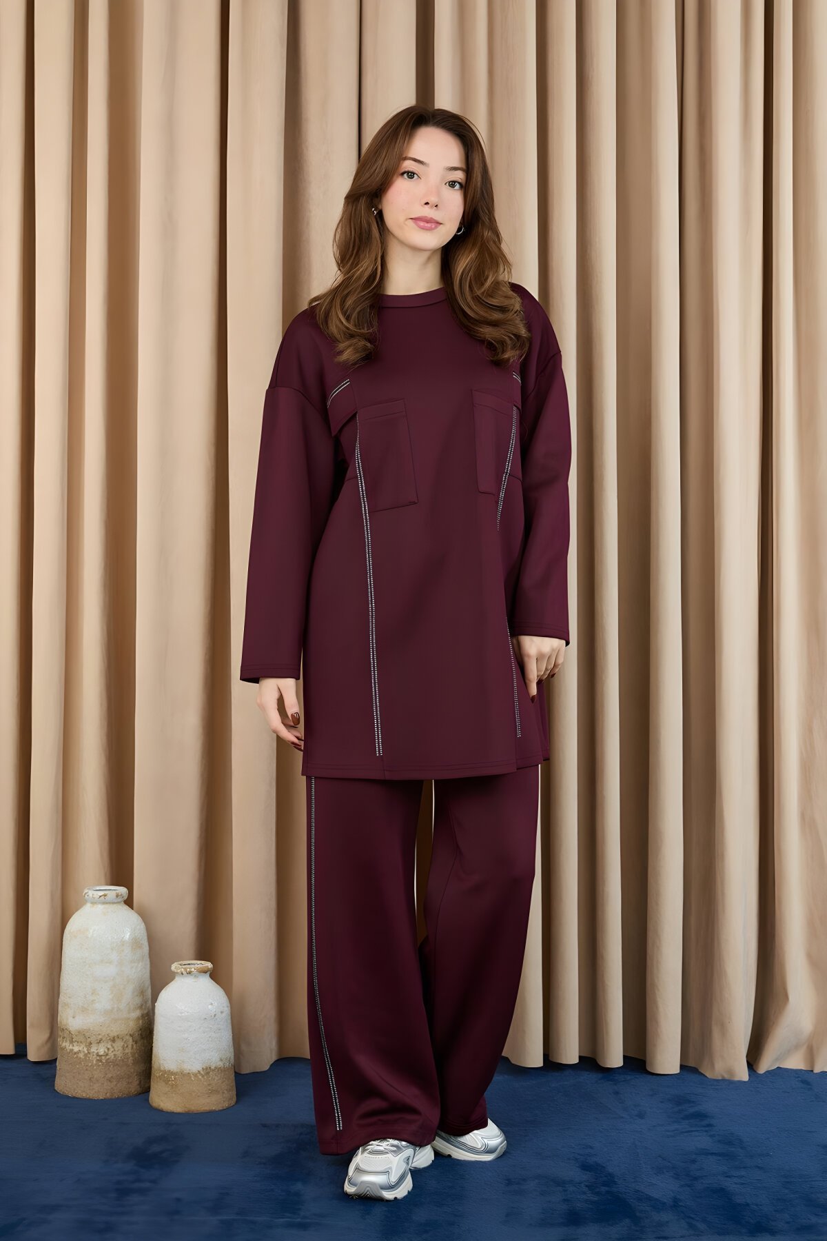 Puane Bordo Taş Detaylı Scuba Kumaş Tesettür Takım