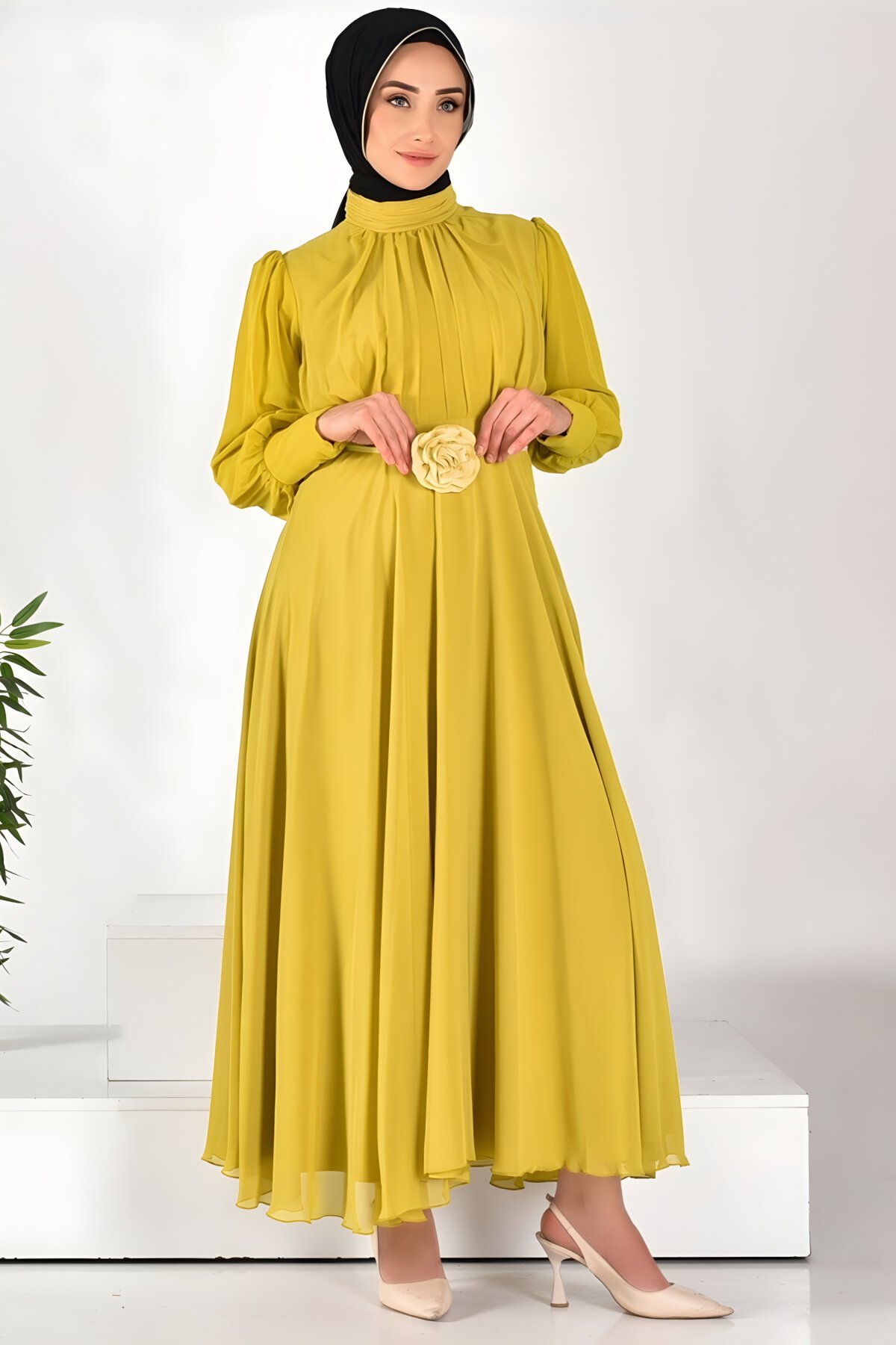 PuanePileli Şifon Kumaş Yağ Yeşili Tesettür Elbise
