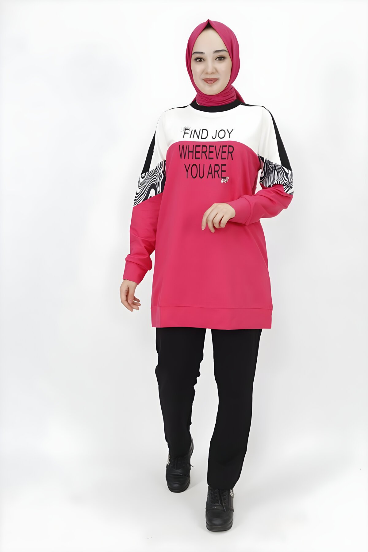 Butikİki İp Kumaş Fuşya Yazı ve Taş Detaylı İkili Tesettür Takım