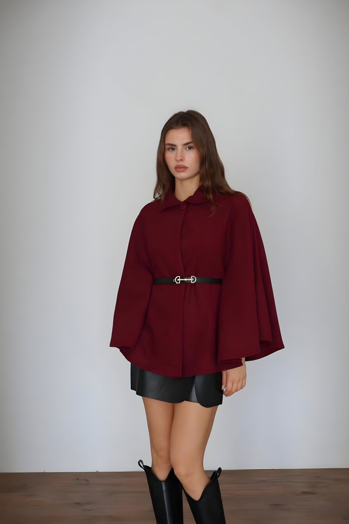 RAWEA FASHİONKemer Detaylı Bordo Kaşe Kumaş Pelerin Panço