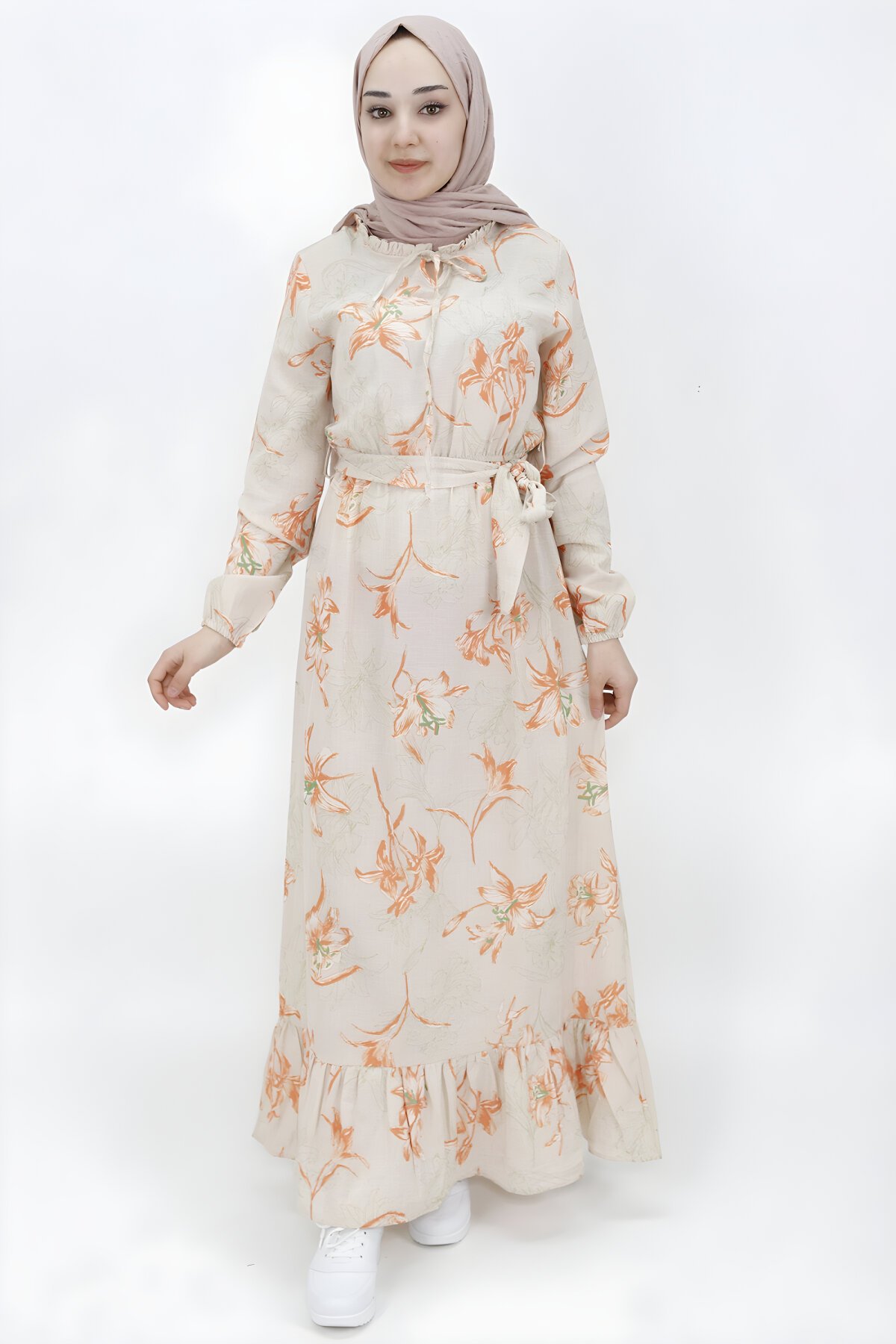 ButikOranj Keten Kumaş Yakası Fırfırlı Tesettür Elbise