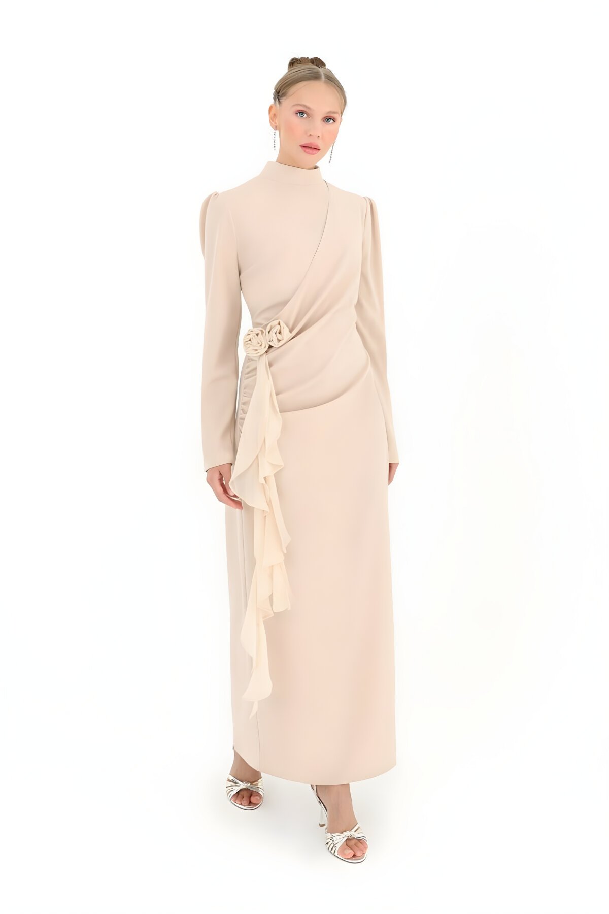 PuaneYandan Bağlamalı Taş Krep Kumaş Tesettür Abiye Elbise