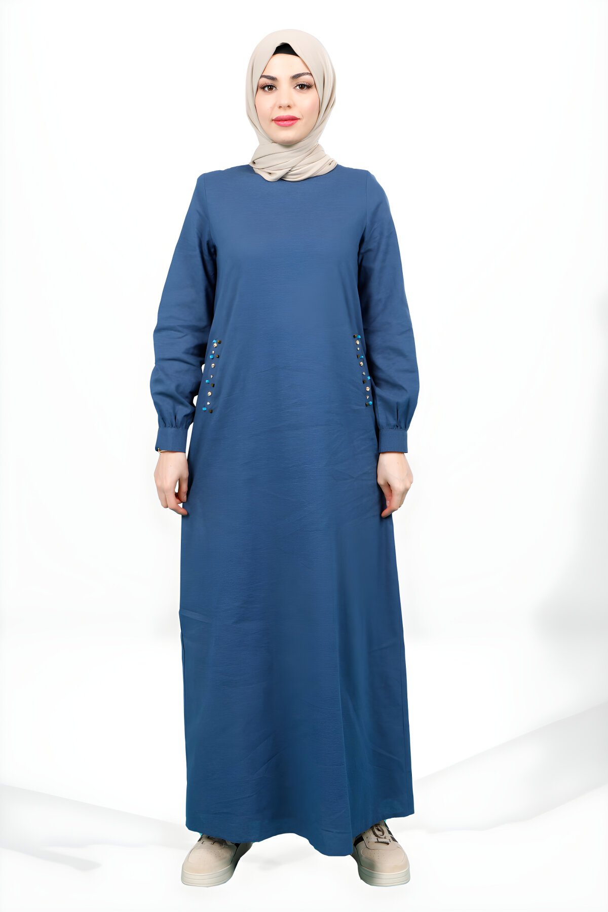 BeyzaLacivert Keten Bisiklet Yaka, Cebi Boncuk Detaylı Tesettür Elbise