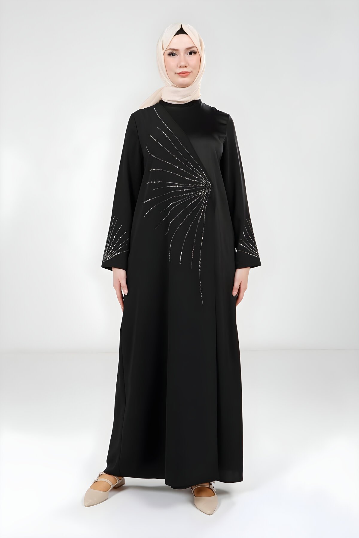 BeyzaSiyah Renk, Taş Süslemeli Zarif Tesettür Abiye Elbise
