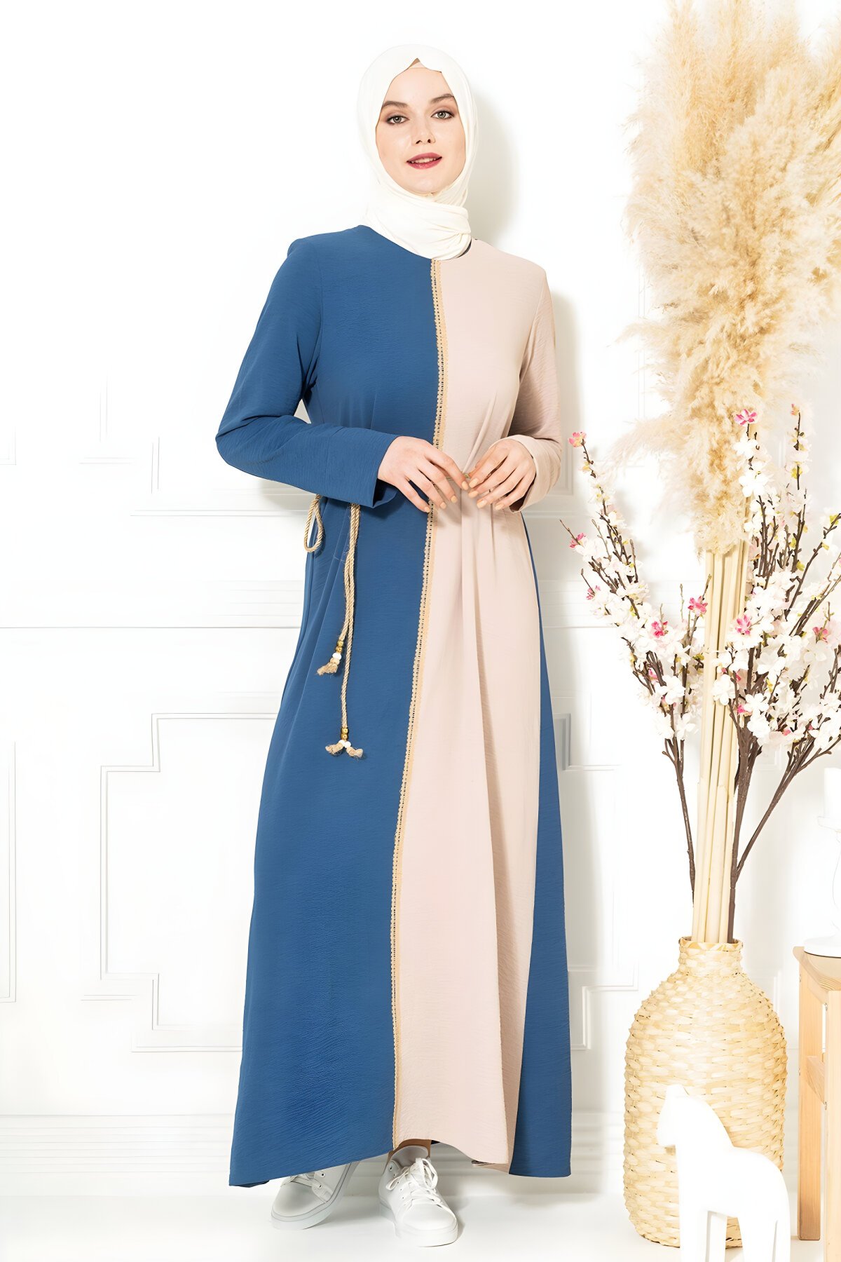 BeyzaHasır Kuşak Detaylı İndigo Bloklu Tesettür Elbise