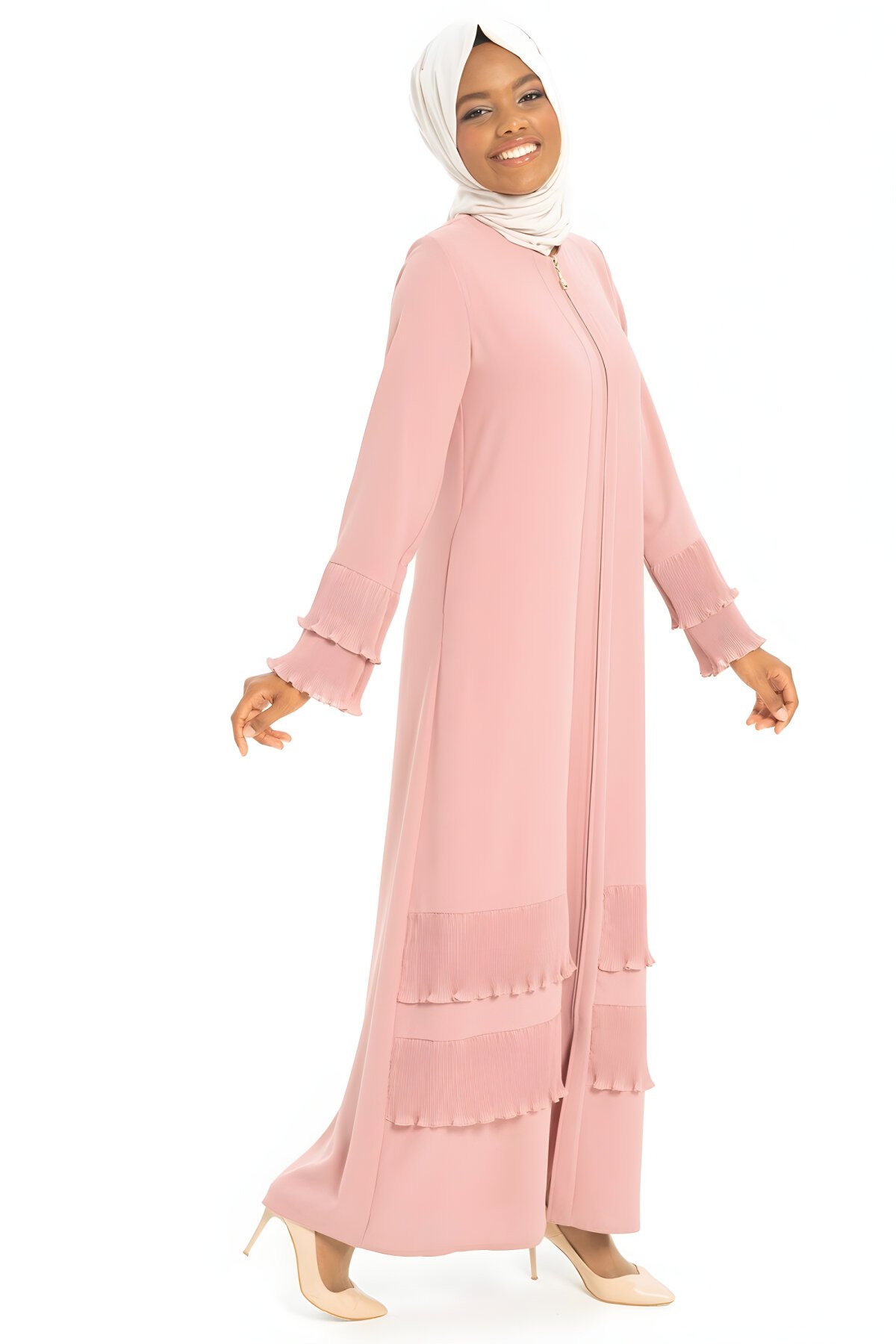 BeyzaFermuar Detaylı Pembe Şifon Piliseli Ferace