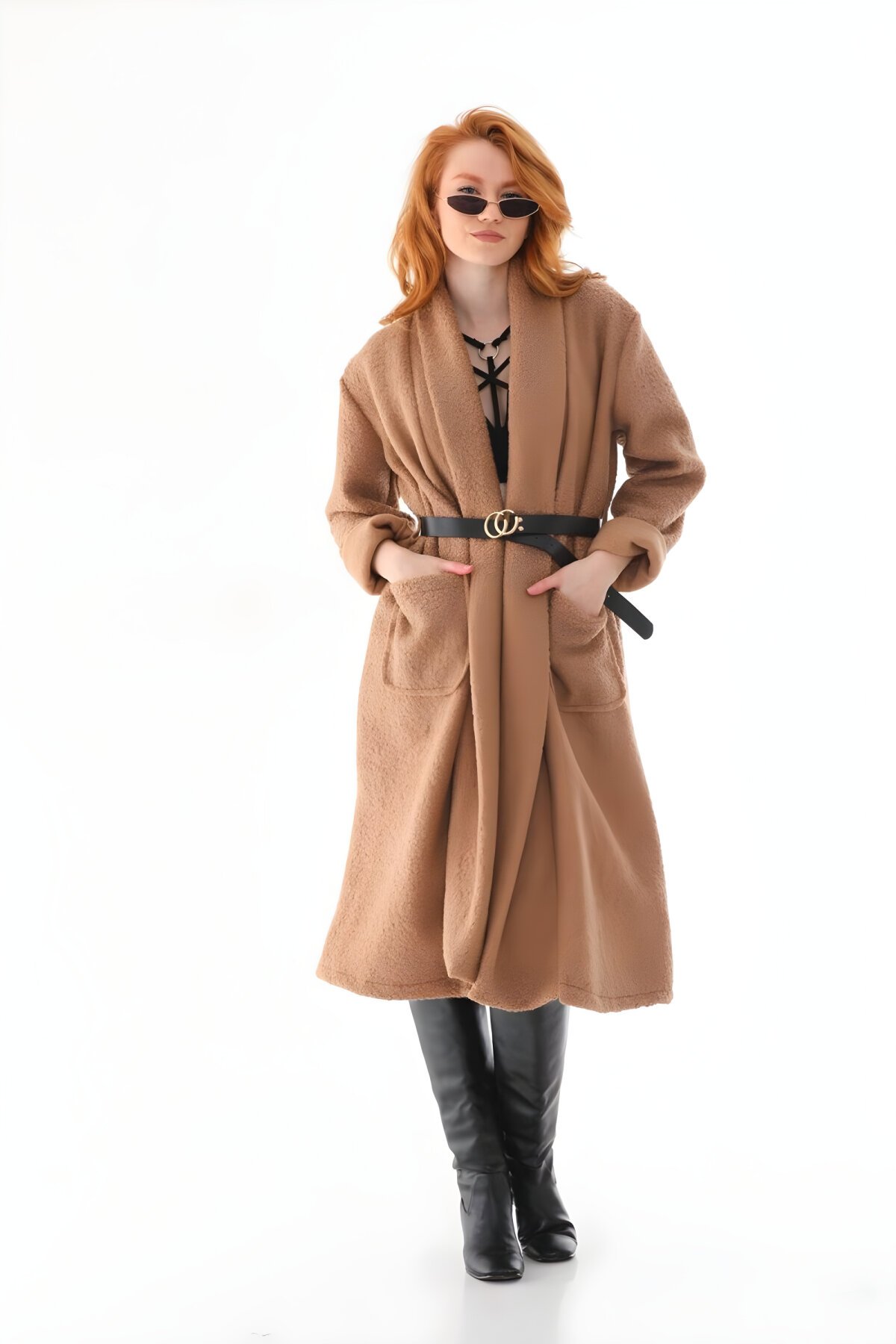 Bohem Stilİtalyan Kemer Detaylı Camel Uzun Keçe Tesettür Kaban