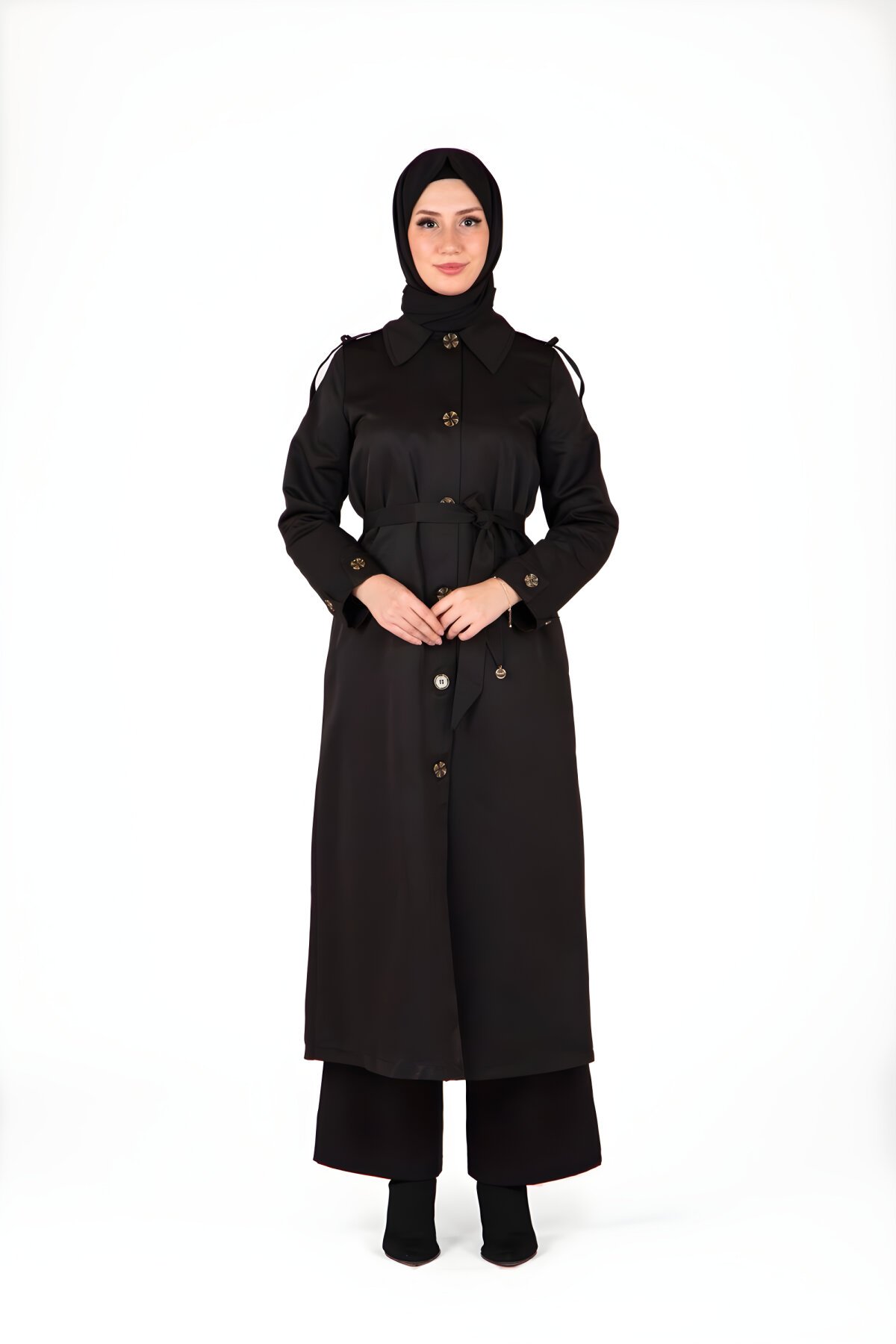 Beyza markasına ait Siyah Apolet Detaylı Ön Kısmı Düğmeli Trençkot, zarif ve kullanışlı yapısıyla modern tesettür giyimin vazgeçilmezi olacak. Günlük ve özel kullanıma uygun bu şık parçayı hemen keşfedin. Geniş ürün yelpazesi Devr-i Tesettür'de sizleri bekliyor.